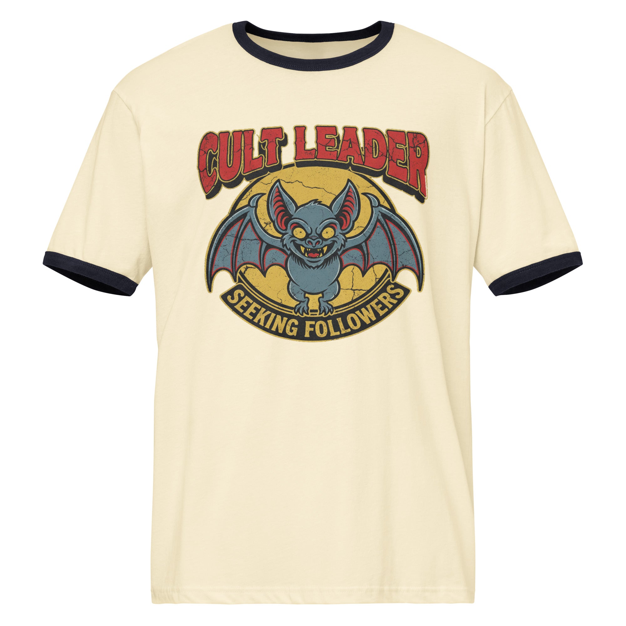 Turn heads with the Cult Leader – Ringer T-Shirt, blending old-school horror vibes with playful dark humor. Featuring a retro-styled bat illustration and distressed vintage texture, this tee delivers a bold aesthetic for anyone who loves unique, alternative fashion.